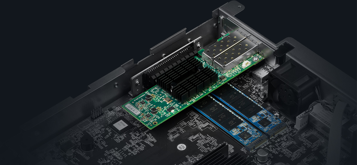 配備 PCIe 3.0 插槽,RS1619xs+ 支持安裝 10GbE/25GbE NIC 以實現(xiàn)快速數(shù)據(jù)傳輸。內(nèi)置 M.2 2280 SSD 緩存插槽能進(jìn)一步增強(qiáng) IO 密集型任務(wù),如虛擬化或郵件服務(wù)器部署。