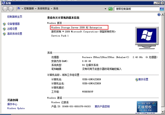 我的電腦右鍵點擊屬性,發(fā)現(xiàn)系統(tǒng)已變成Windows Storage Server 2008 R2,成功將Windows Server 2008 R2轉(zhuǎn)換。